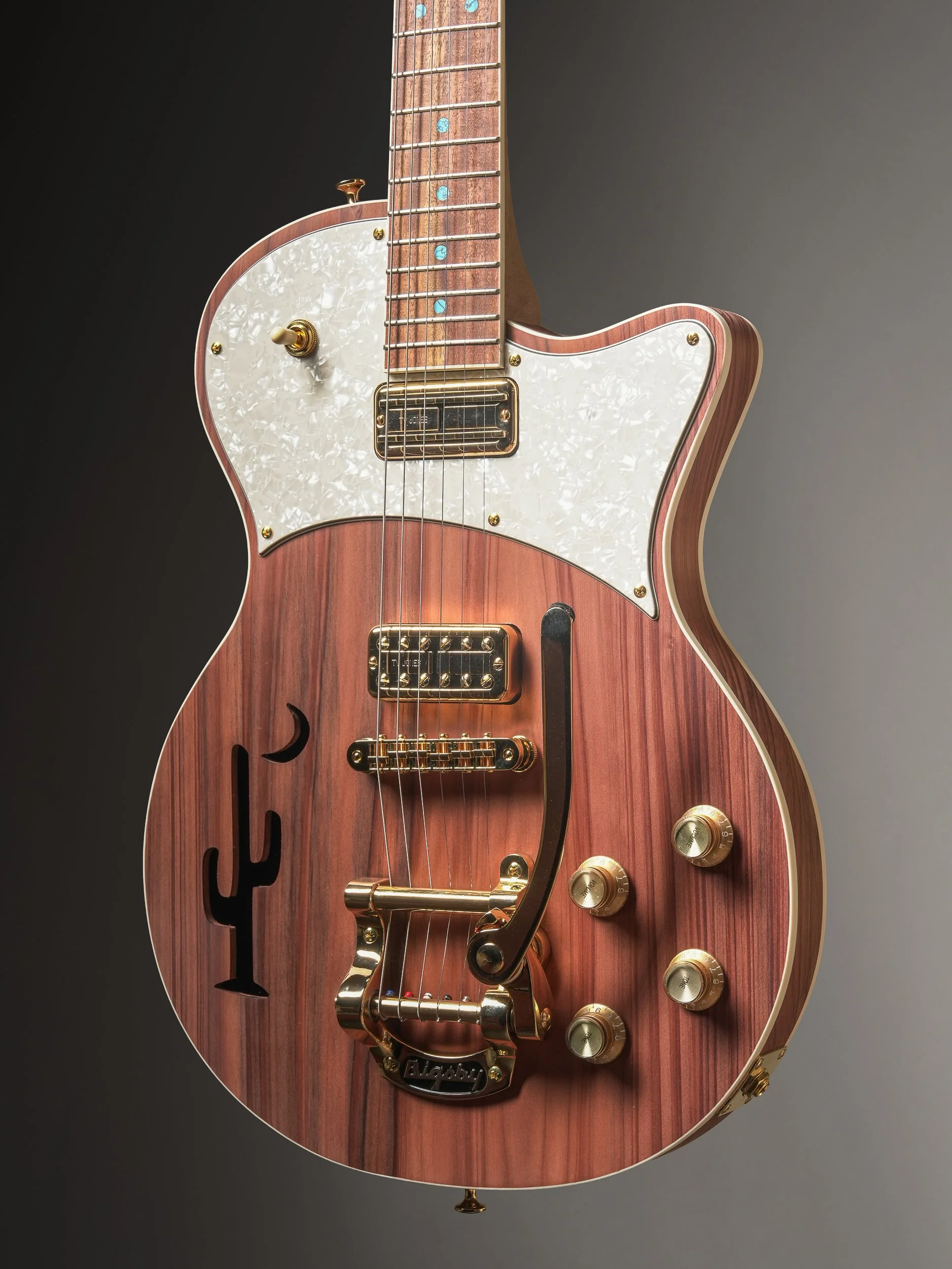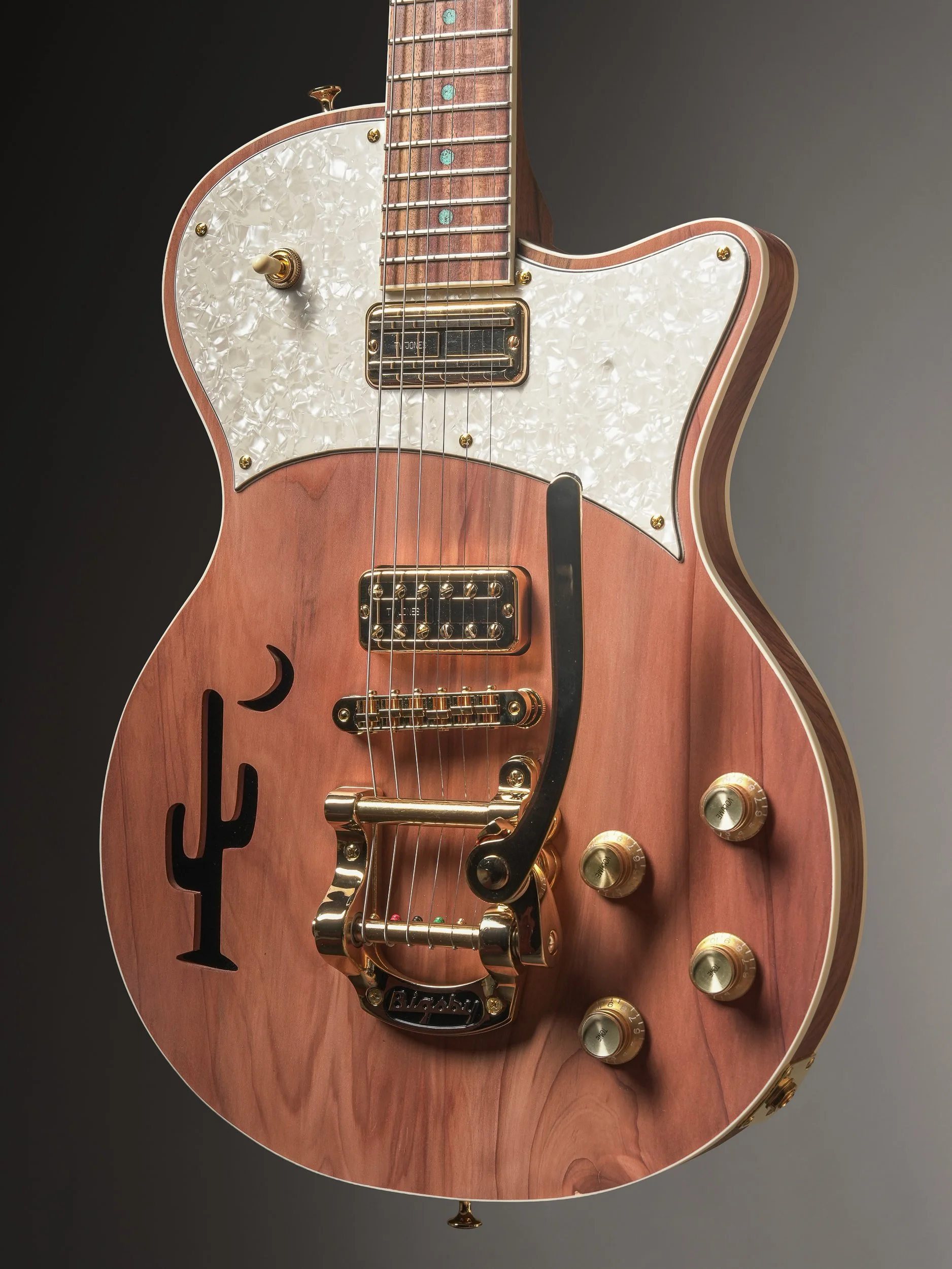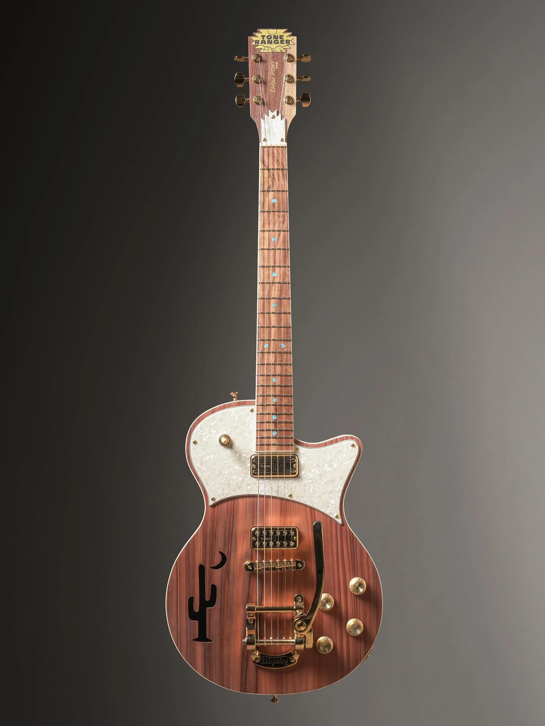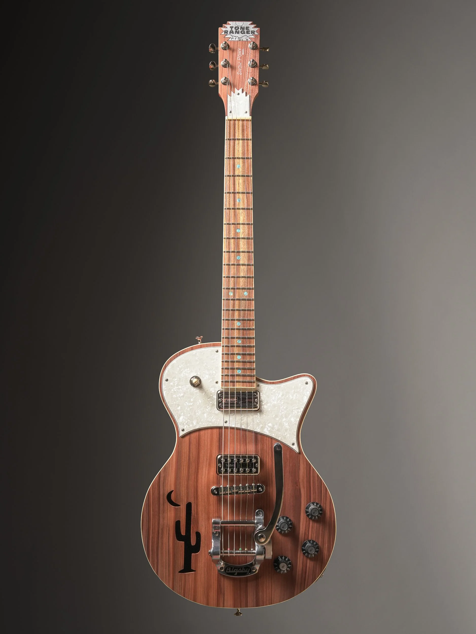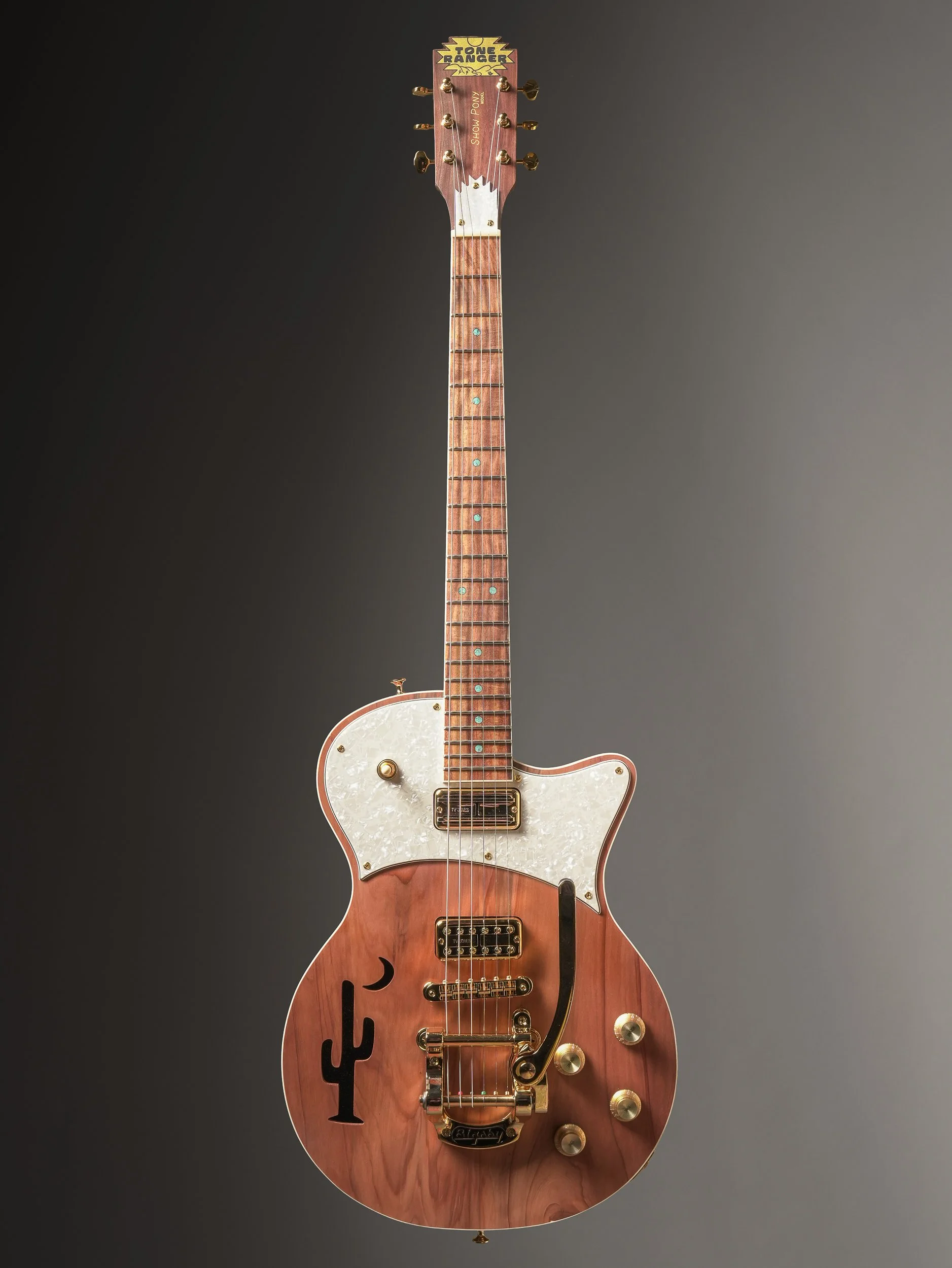 Not just for show, the Tone Ranger Guitars “Show Pony” model is meant to be rode hard and deliver every time. With the seated session player in mind, I shifted the neck forward and lengthened the contour of the waist, resulting in a voluptuous shape that sits perfectly balanced while providing superior upper fret access without the neck dive—even when standing. Inspired by Gretsch solid bodies of the ‘50s, the Show Pony’s wide tonal range includes the Nashville Sound, the Bakersfield Sound, and most importantly, Your Sound.